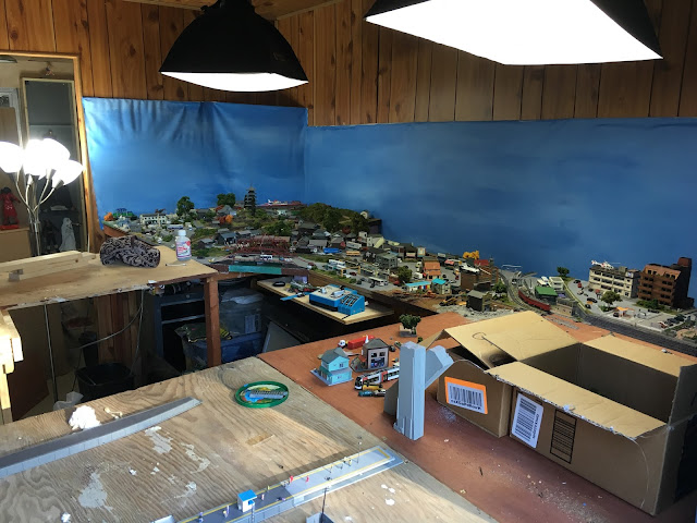 I believe that most of the buildings and the like that I have will fit in nicely with the new design. I plan on getting the track dialed in, tested and approved before tossing too many buildings back onto the layout, but I had to place a few.....you know....just to see. :)